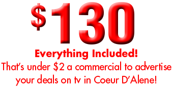 Complete the order form below to advertise your business's sales and deals in "Great Deals In Coeur d'Alene" tv commercials. These commercials are an easy, low cost way to advertise your sales and deals on tv and get more customers.